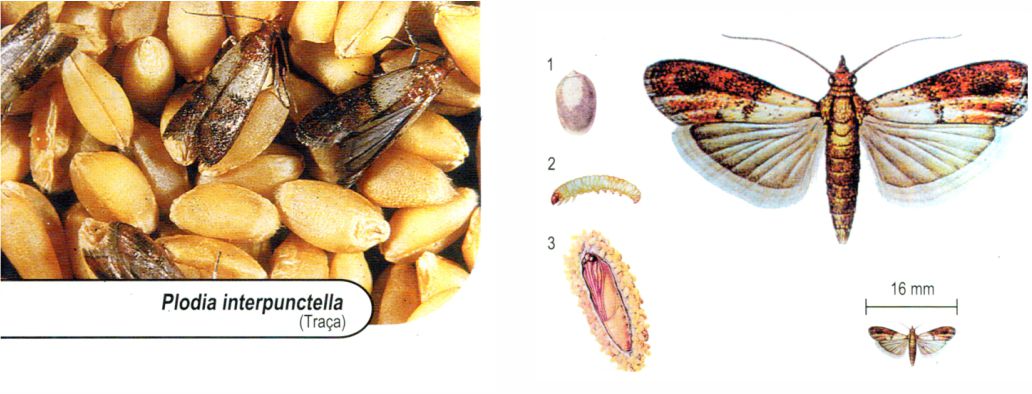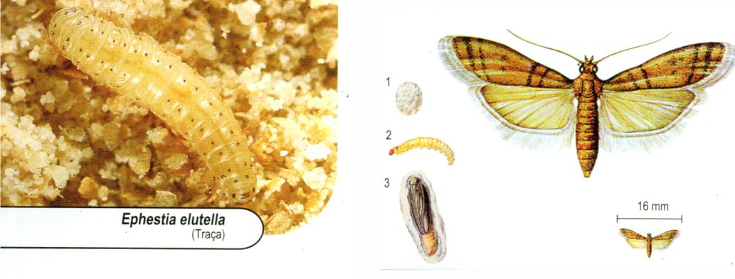 Pupas – Podem formar-se imediatamente, transformando-se em traças adultas. Porém, grande parte apenas se transforma no ano seguinte, mantendo a infestação.