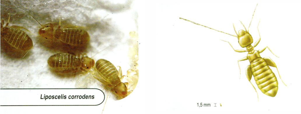 Comum em armazéns graneleiros, moinhos e plantas de processamento de alimentos, em locais quentes, úmidos e pouco ventilados. Pequeno, achatado e de coloração esbranquiçada, antenas similares a pêlos longos.