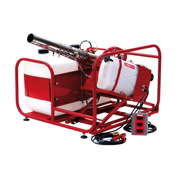Termonebulizador de modelo veicular, para uso tradicional (fog) ou para aplicação de formulações à base de água UBV-T, com uma autonomia muito maior que o modelo portátil, pois é constituído por dois tanques de formulação com capacidade de 50l cada. Possui partida com controle remoto e com canhão regulavel .